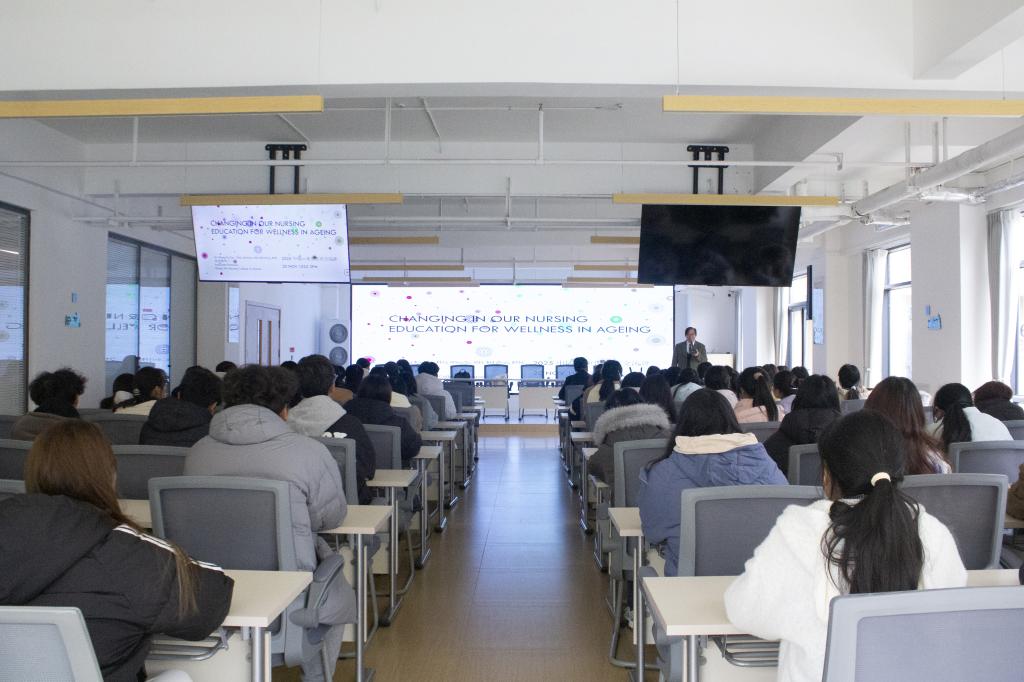 On the afternoon of November 20, 2025, Associate Professor Wong Ka Fai from Kiang Wu Nursing College of Macau delivered a sharing session titled "Changing Our Nursing Education for Wellness in Ageing" at Kangming Student Center of Guiyang Kangyang University. The session systematically compared the similarities and differences between the healthcare education systems in Macau and mainland China, while also sharing innovative practices from Macau in areas such as long-term elderly care and community health management.