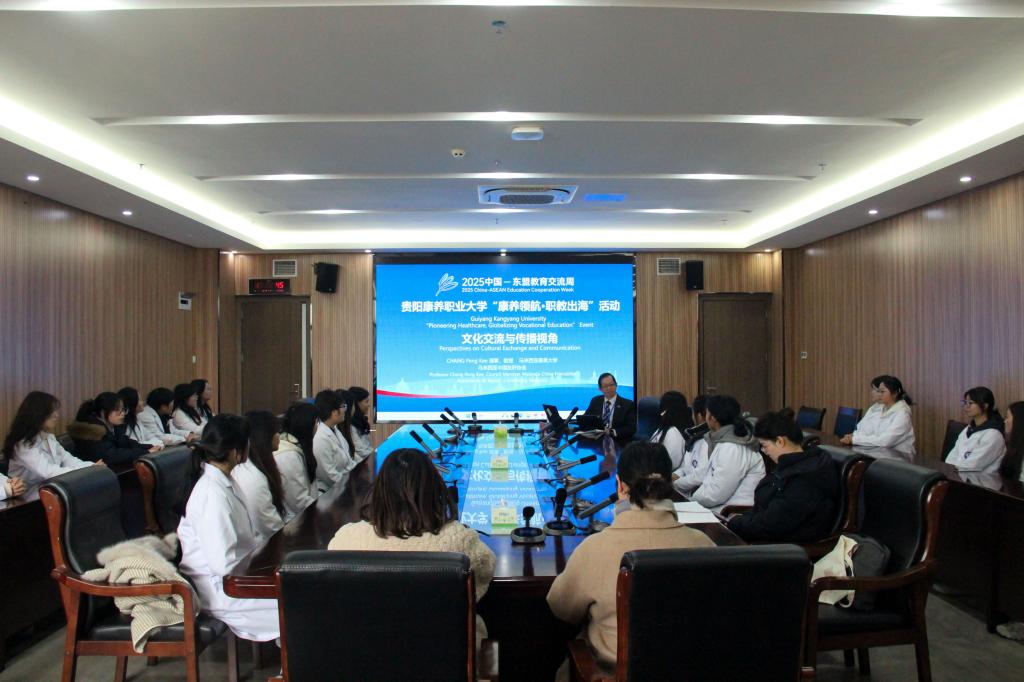 On the afternoon of November 20, 2025, Chang Peng Kee, Council Member of the Malaysia-China Friendship Association and Professor at Taylor’s University, delivered a lecture titled "From the Perspective on Cultural Exchange and Communication" at Guiyang Kangyang University. Drawing from Malaysia’s experience in healthcare vocational education, Professor Chang emphasized the central role of cultural understanding in cross-national cooperation. He also shared case studies of Malaysia-China collaboration in promoting joint curriculum development and faculty exchanges.